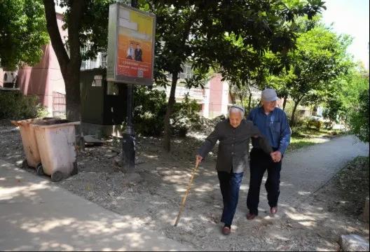 黄刘氏在儿子黄才荣的搀扶下在小区散步(新华社2018年4月19日摄)