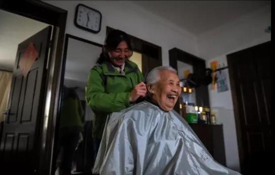 护工给黄刘氏梳理头发(新华社2018年4月19日摄)
