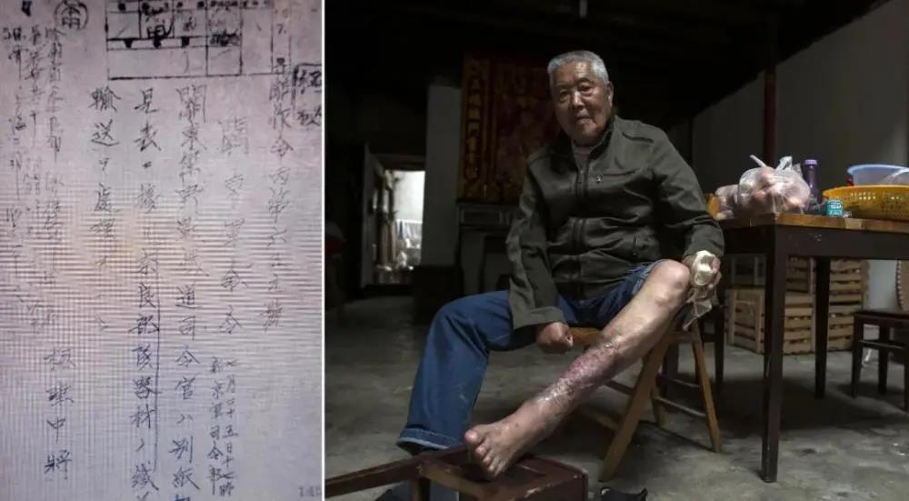 左图:被公布的731部队参加浙江细菌战的作战命令(翻拍);右图:侵华日军细菌战幸存者、浙江省丽水市莲都区联城街道长濑村老人冯欢喜坐在家中。