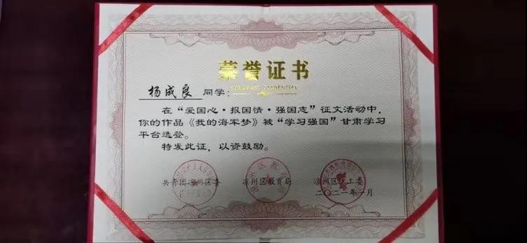 在去年的“爱国心·报国情·强国志”大型征文活动中,刘文娜指导学生写了一篇名为《我的海军梦》的文章,她找来很多相关历史资料,让学生每阅读一次都会有新的感悟。最后这篇文章经过12次的修改打磨,被“学习强国”甘肃学习平台选登。