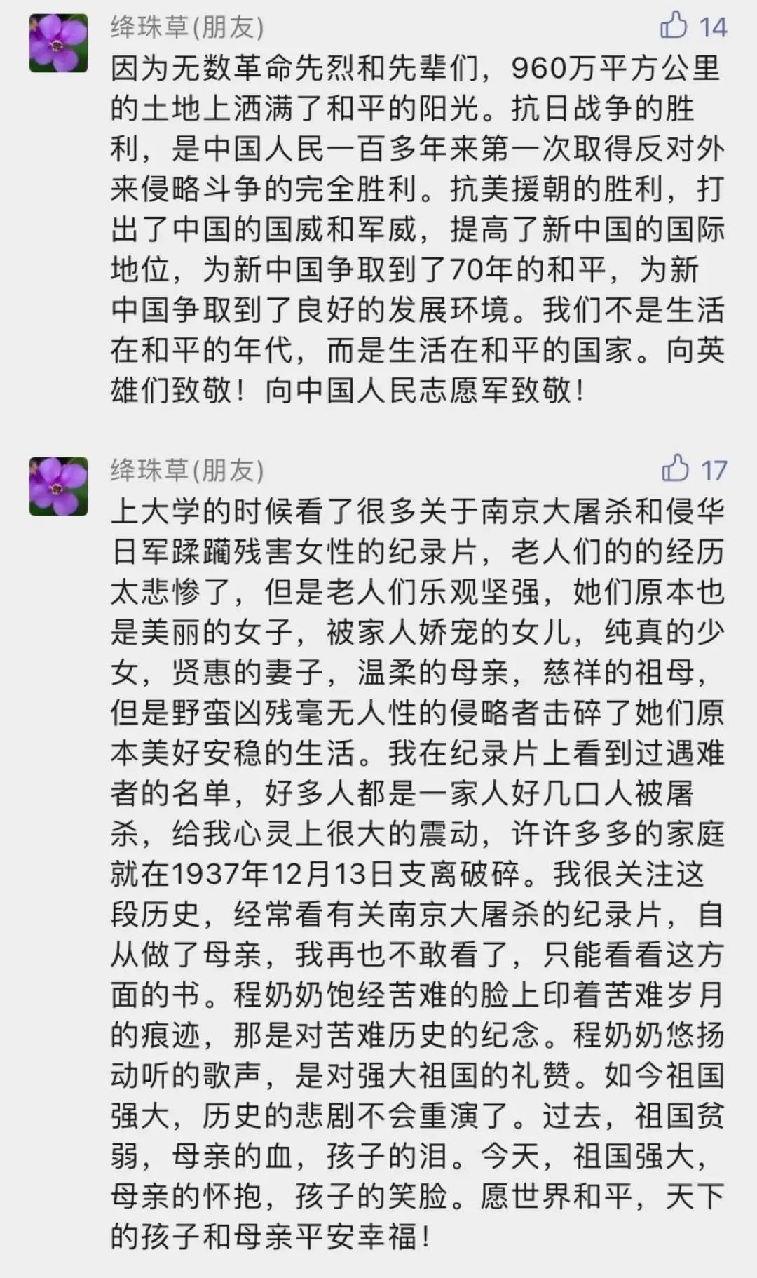 刘文娜是一个普通人,但她不仅在互联网上积极参与传播“铭记历史,珍爱和平”的理念,在生活的点滴里、在本职的教学工作中,也在为历史事实、爱国主义思想、和平理念的大众化贡献着自己的一份力量。