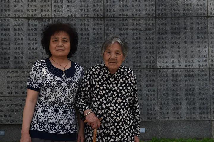 马秀英(右)和儿媳孙秀英在我馆“哭墙”前合影(新华社 2016年6月17日摄)