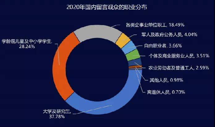 在职业上,留言观众覆盖大学本科及研究生、中小学学生及学龄前儿童、各类企事业单位职工、军人、公务人员、产业工人、农业劳动者、自由职业者、离退休人员等9类职业,其中学生群体占6成以上,是留言的主要人群。