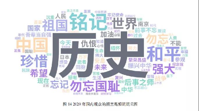 在国内观众100个高频词和国外观众50个高频词中,“历史”“铭记”“和平”“勿忘”“中国”等是出现频率较高的词语,不忘南京大屠杀历史,是人们参观后的普通感受。