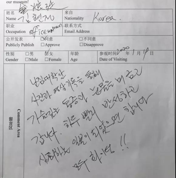 一位来自韩国的观众写道:通过参观南京大屠杀照片和影像,我感触很深,心很痛,眼角流下了伤痛的泪。我希望日本尽快反省和谢罪,我们大家一起加油。