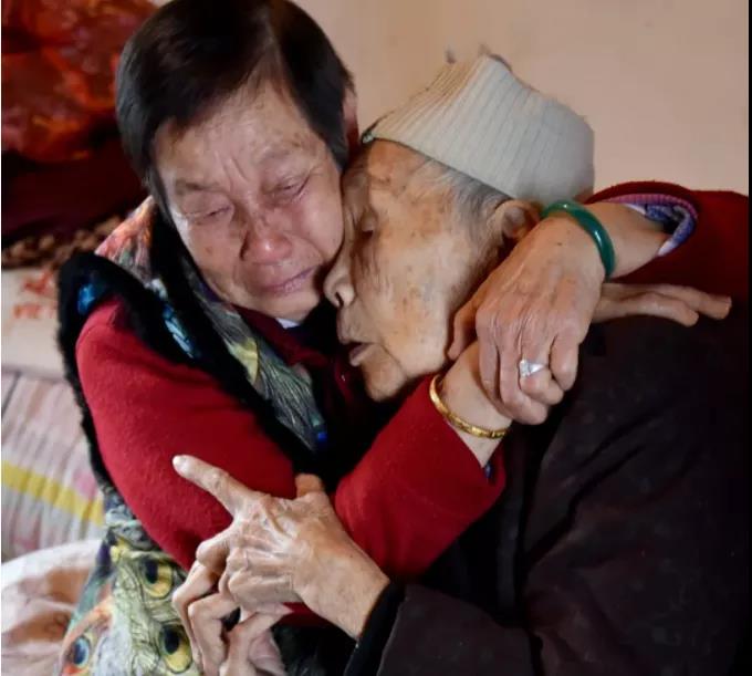 11月20日上午,湖南岳阳华容县一幢独立小三楼上,85岁的张二英抱住97岁的雷金二(雷金安)老人抱头痛哭。78年前,雷金二想方设法护住了还是小女孩的张二英,而自己却被日军掳为“慰安妇”。