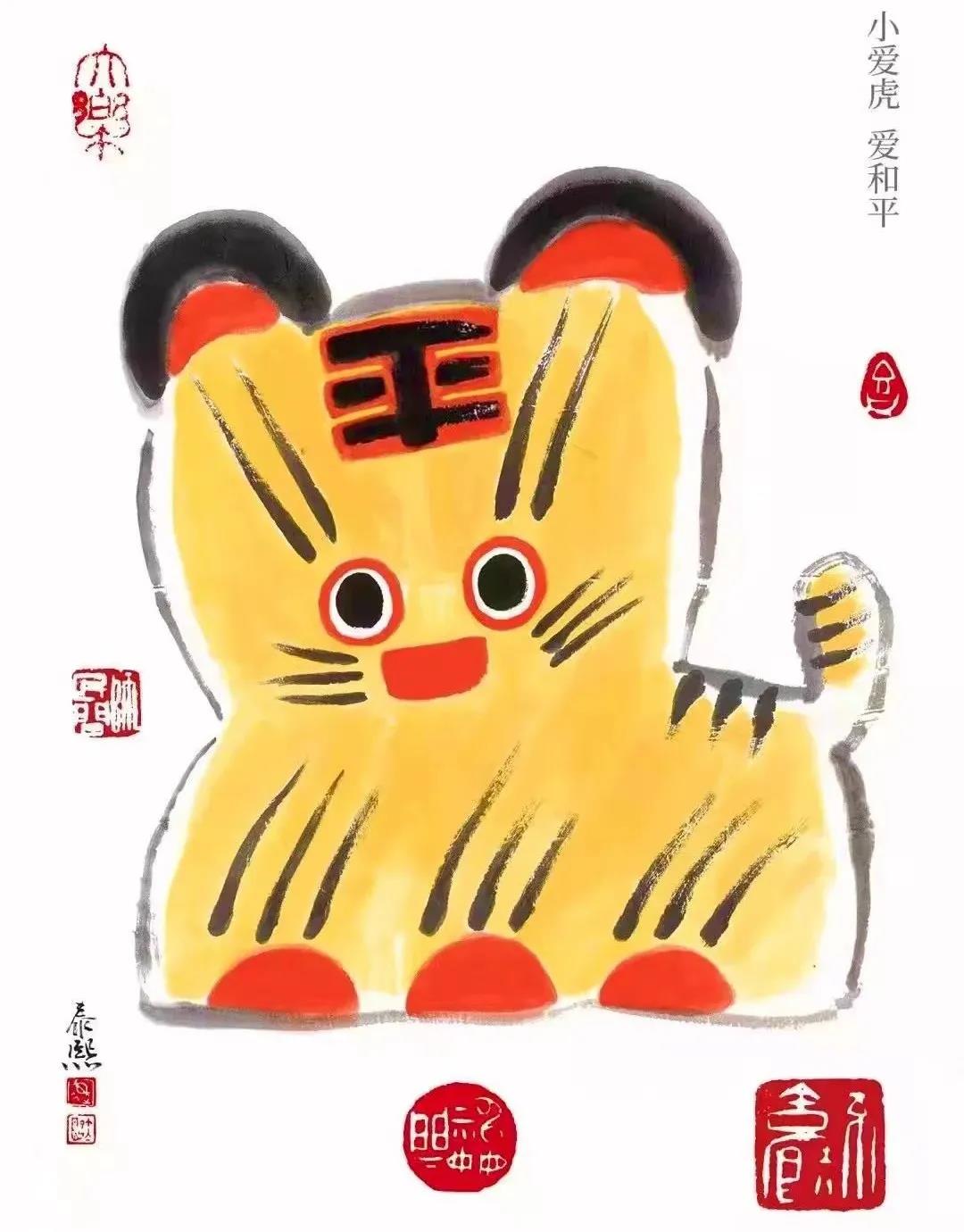 “小爱虎”取材于中国传统的“端午艾虎”,最初人们用艾草编成老虎,后来又衍生出香囊老虎等多种形态。这只小爱虎瞪着圆溜溜的眼睛,几笔劲道的笔触既表现出了老虎的花纹,又将老虎呆萌的感觉展露无遗。