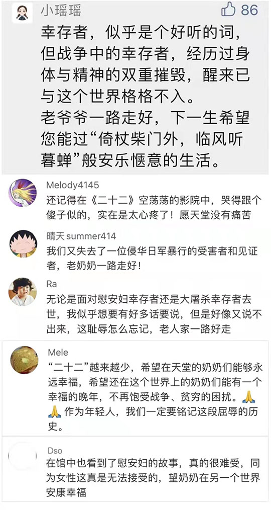 2月,我们含泪送走日军“慰安妇”制度受害幸存者郴州奶奶、章奶奶(均为化名),南京大屠杀幸存者祝再强爷爷、濮业良爷爷。老人们已化作天上的星星,愿你们一路走好!幸存者正在老去,他们直面苦难的勇气,积极、乐观、开朗的生活态度激励了无数网友。
