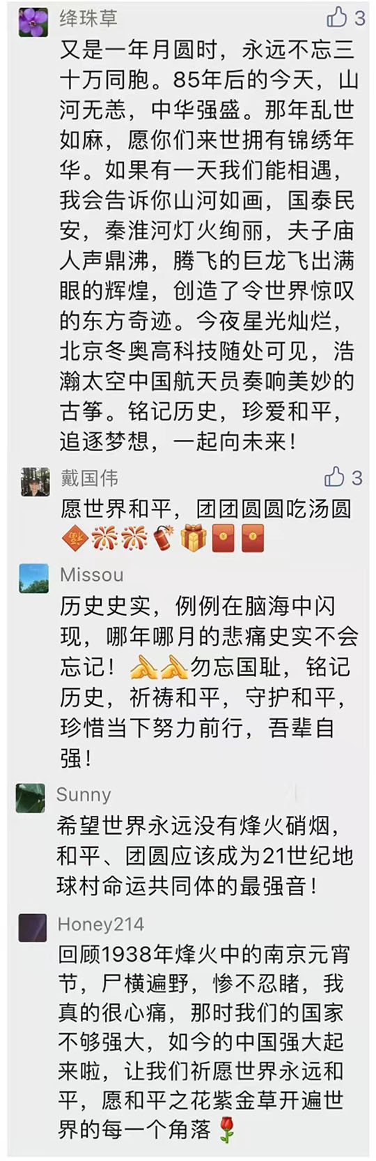 2月,我们欢度春节、元宵节,这些触手可及的幸福平凡又温暖,但在1938年对于烽火硝烟中的南京人民来说,“节日”二字分外奢侈。“和平、团圆应成为时代主题”,“愿和平之花紫金草开遍世界”“祈愿世界永久和平”……众多网友表达和平心愿。