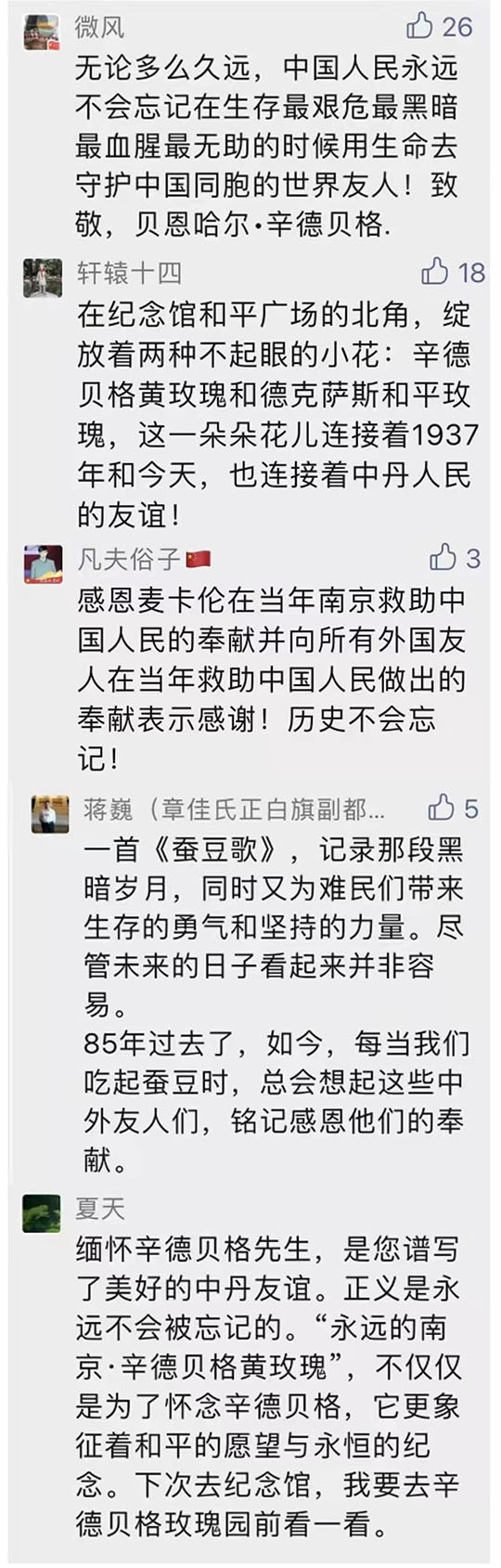 2月19日是辛德贝格111周年诞辰,他在南京的106天里救助了近2万难民。1938年2月21日,“粮食运送大使”麦卡伦写下了《南京难民合唱曲》,为难民带来生存的勇气和力量。“不会忘记守护中国同胞的国际友人”“辛德贝格黄玫瑰连接着中丹人民的友谊”……网友纷纷留言。