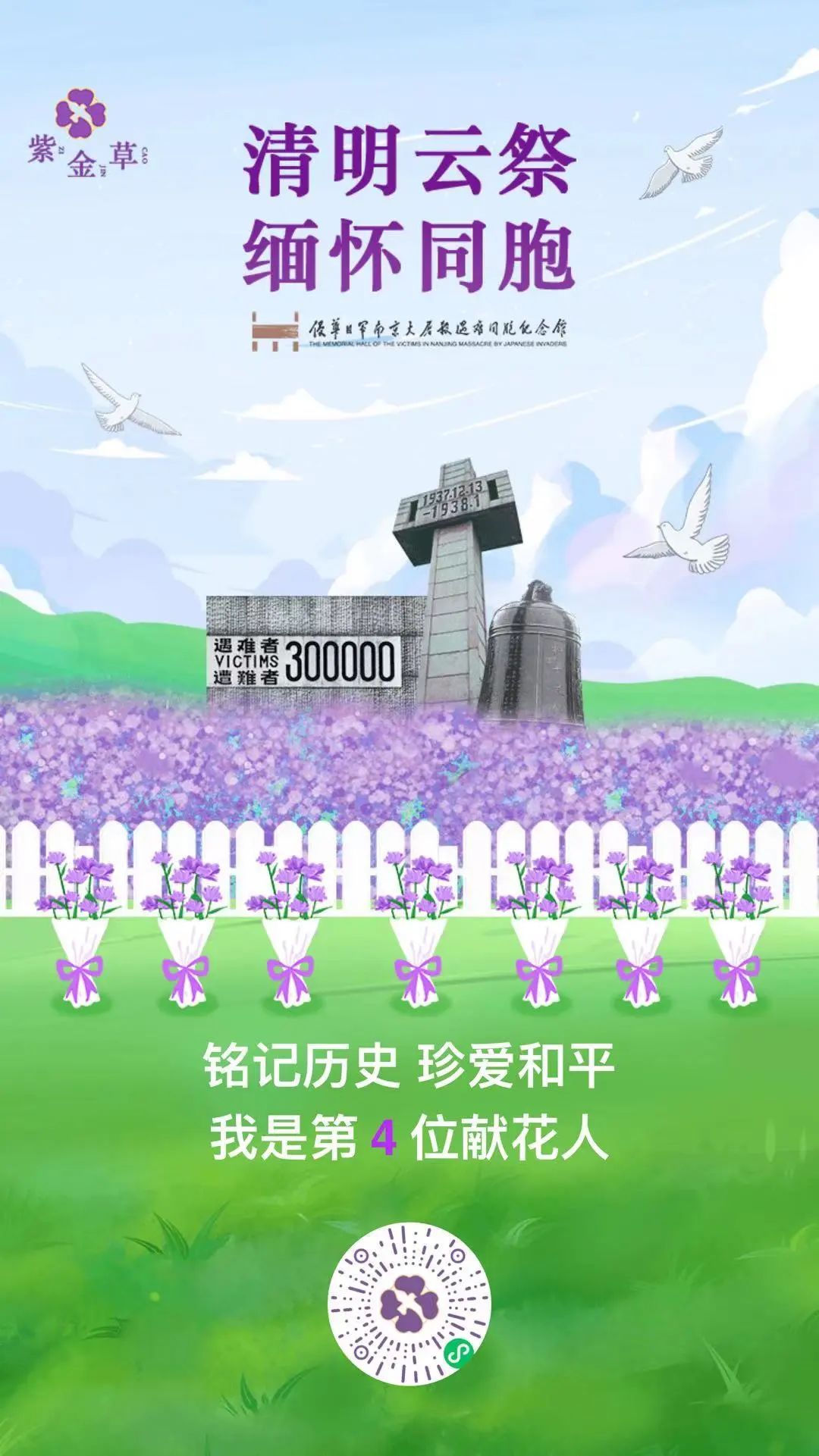 紫金花开,记忆传承,我们推出H5作品——《一起种下紫金草》,扫描下图二维码,进入云祭页面。您将化身紫金草女孩,领取一枚紫金草花种,并为和平花种浇水。您还可发布寄语,“云”祭遇难同胞,待到紫金花开时,欢迎您来到“献花广场”,献上您播种的紫金草花束。