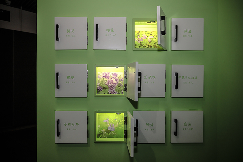 该装置由12个小盒子组成,每个盒子都代表了一种花语,紫金草寓意和平、鸢尾花寓意力量、辛德贝格黄玫瑰寓意勇气、梅花寓意坚强……打开盒子可以闻到每种植物独特的清香。通过这一仪式化教育方式,观众可以去感知花语的内涵,了解每朵花背后的故事。