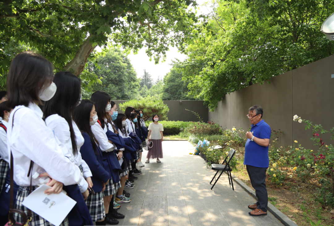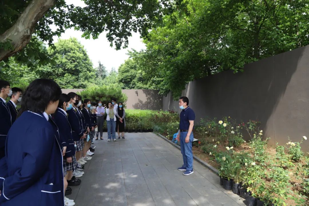 玫瑰花圃内,同学们体验劳育课程,挥锹铲土、提水浇灌,种下了一株株辛德贝格·黄玫瑰,感恩丹麦友人辛德贝格在南京大屠杀期间对中国难民的庇护,学习他的勇敢、善良和大无畏的精神。