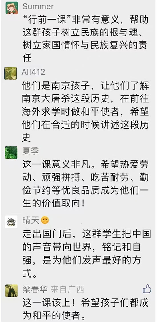 5月,百名南京学子在出国留学前走进纪念馆,参加紫金草国际和平学校交流活动,接受爱国主义与和平学教育,上了一堂特别的“行前一课”。“让和平的种子在世界各地生根发芽”、“把中国的声音带向世界”……网友纷纷点赞。
