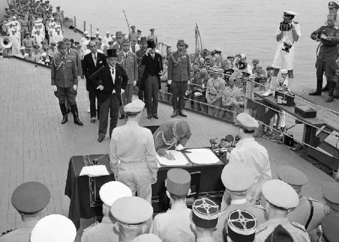 重光葵和梅津美治郎依次在英日两种文本的投降书上签字后,接受投降的盟军最高统帅麦克阿瑟上将、美国代表尼米兹海军上将、中国代表徐永昌将军、英国代表福莱塞海军上将、苏联代表杰列维亚科中将,以及澳、加、法、荷、新西兰等国代表依次签字受降。