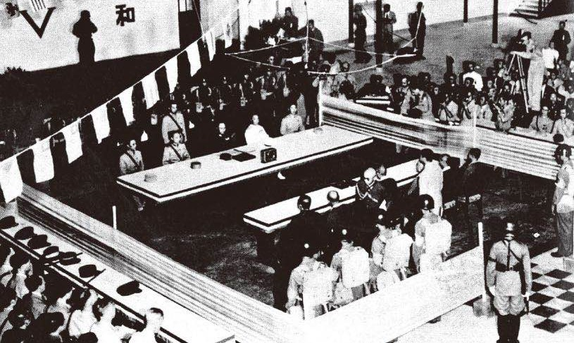 台湾省行政长官兼台湾警备总司令陈仪(右)接受日本台湾军参谋长谏山春树(左)呈递的降书