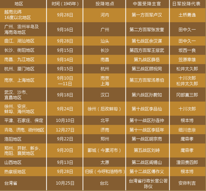 1945年9月至12月,16地举行了驻地日军的投降仪式。中国共产党领导的抗日根据地军队,坚决捍卫接受日本投降的权力,自主接受根据地内侵华日军的投降。