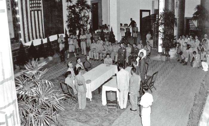 中国陆军参谋长萧毅肃(中)、副参谋长冷欣(右)、中国战区美军作战司令部参谋长柏德诺(左)在芷江洽降会场