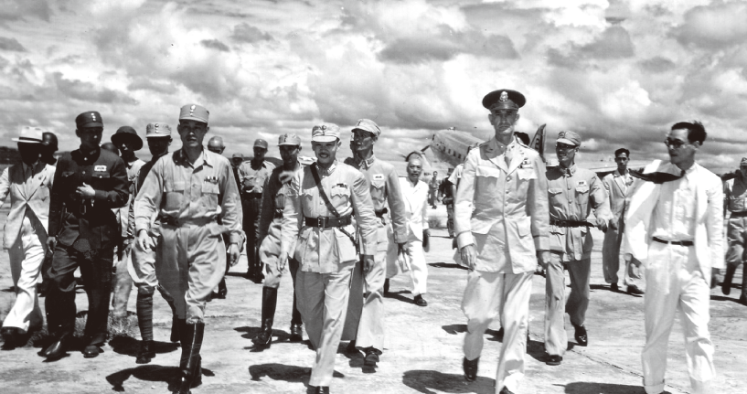 中国第二方面军司令长官张发奎(右三)和美国陆军准将鲍曼(右二)抵达广州白云机场