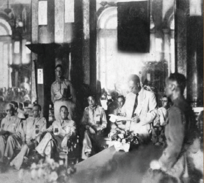 越南河内人民向中国陆军第一方面军司令长官卢汉献旗,欢迎中国军队赴越南接受日军投降