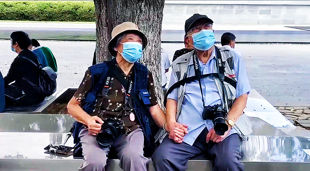 刘健芝、祁恩芝是一对年过九旬的老夫妇,从1994年南京首次公开集会悼念遇难者,便来到纪念馆拍摄记录,至今已经整整29年。他们选择坐在“生命之力”座椅上休息,一边观赏坚韧不拔的紫金草,一边聆听《南京难民合唱曲》。他们说,生命与生命是相通的……