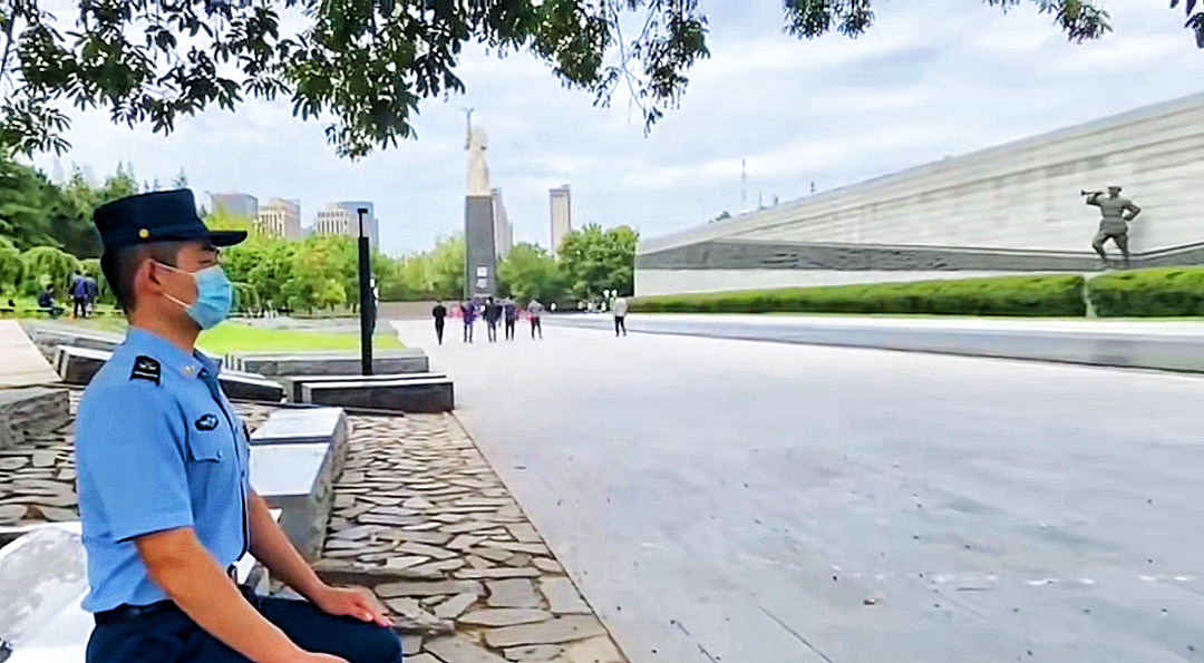 中国人民解放军空军军士张恩超在“胜利之声”座椅上坐一坐,凝视眼前的“胜利之墙”,聆听着《胜利号角》。他说:“一代人有一代人的使命,哪里有危难,哪里就有军人在冲锋。抗日战争时期,热血青年纷纷奔赴抗日战场,浴血奋战。如今,我作为一名军人,要履行保家卫国的神圣使命。”
