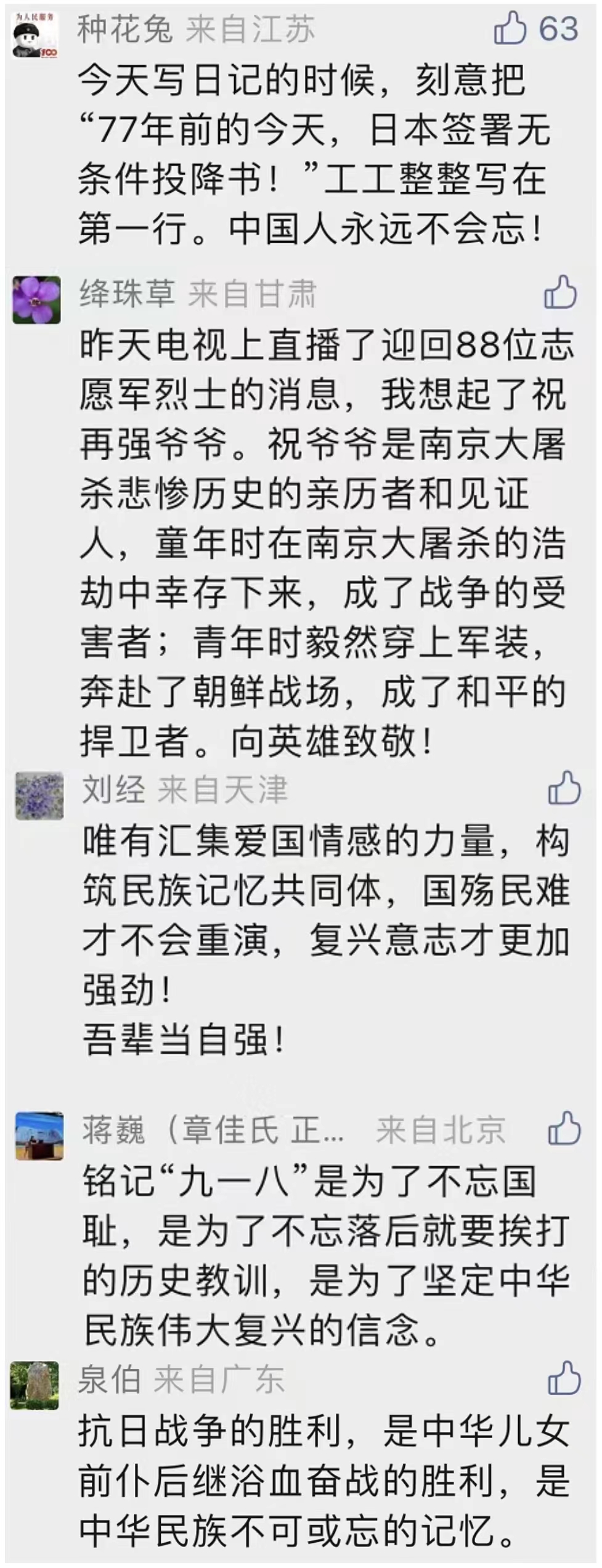 我们还设置了#九一八事变91周年#、#抗战胜利日#等微博话题,大家在网络中“云聚集”。“铭记历史,警钟长鸣”、“国耻不能忘,吾辈必自强”、“中华民族不可忘却的历史”……网友接力传递历史,纷纷抒写心中的感想。