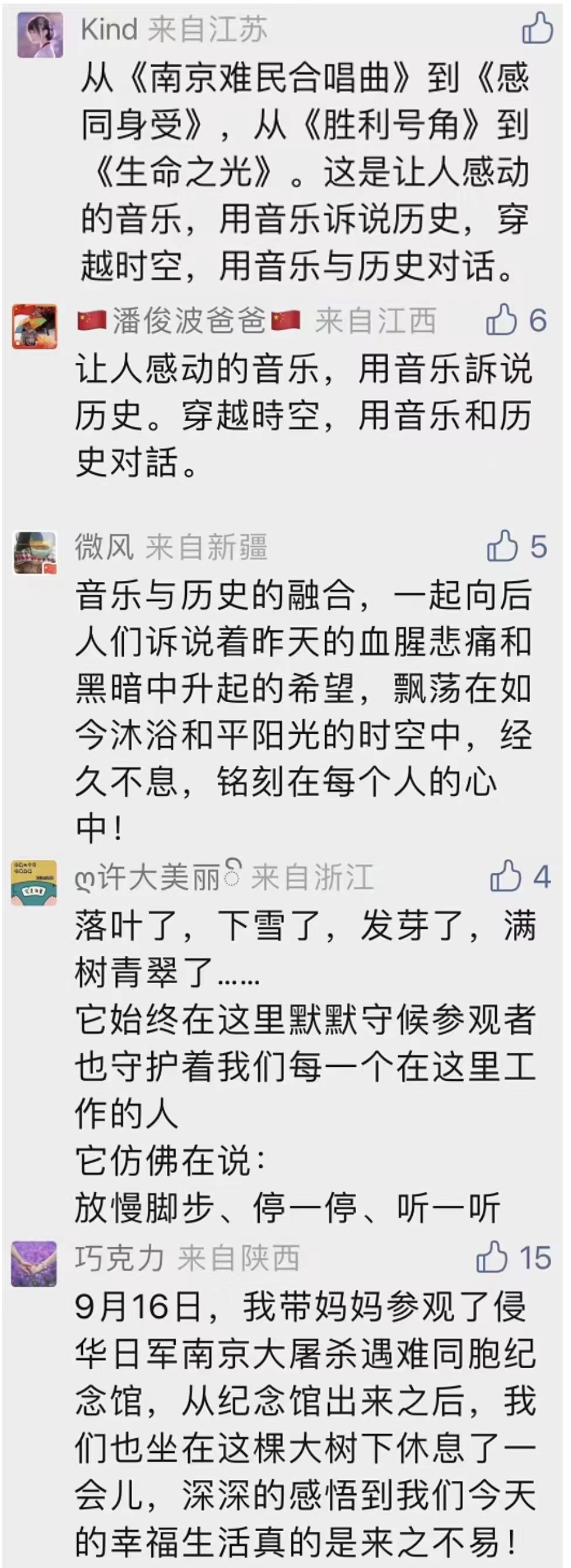 很多观众参观史实展后,会来到位于和平公园中的枫杨树下休息。最近,观众发现坐在树下能听到音乐。一边听歌,一边回溯、思考、展望……在歌声里回望历史,憧憬和平,感受生命的顽强和胜利来之不易。