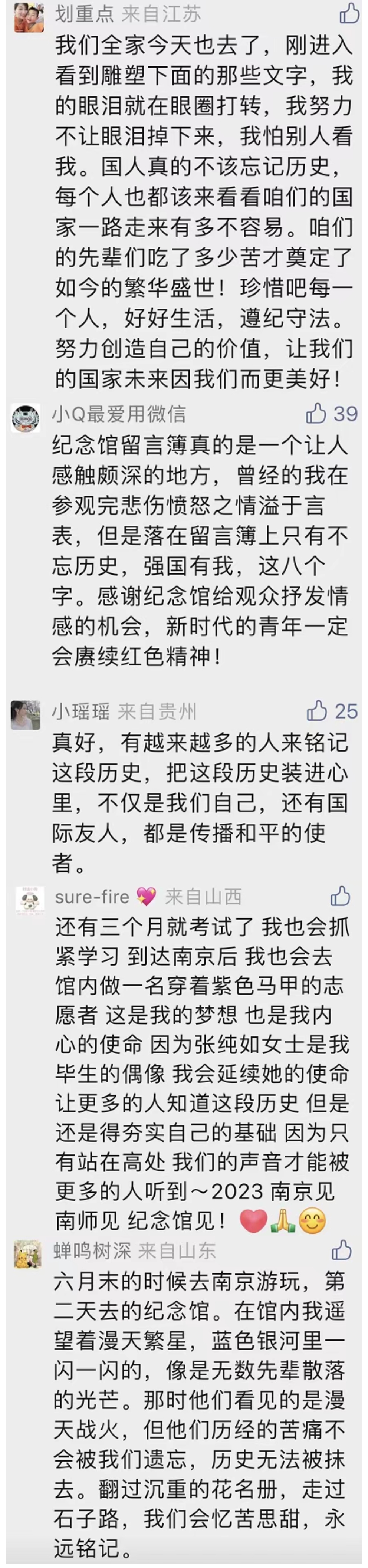 “每位家长都应该对孩子进行爱国主义教育”、“到达南京后,我也会去纪念馆做一名紫金草志愿者”……远道而来的你们写下的每一句感言和鼓励,我们都收到了!