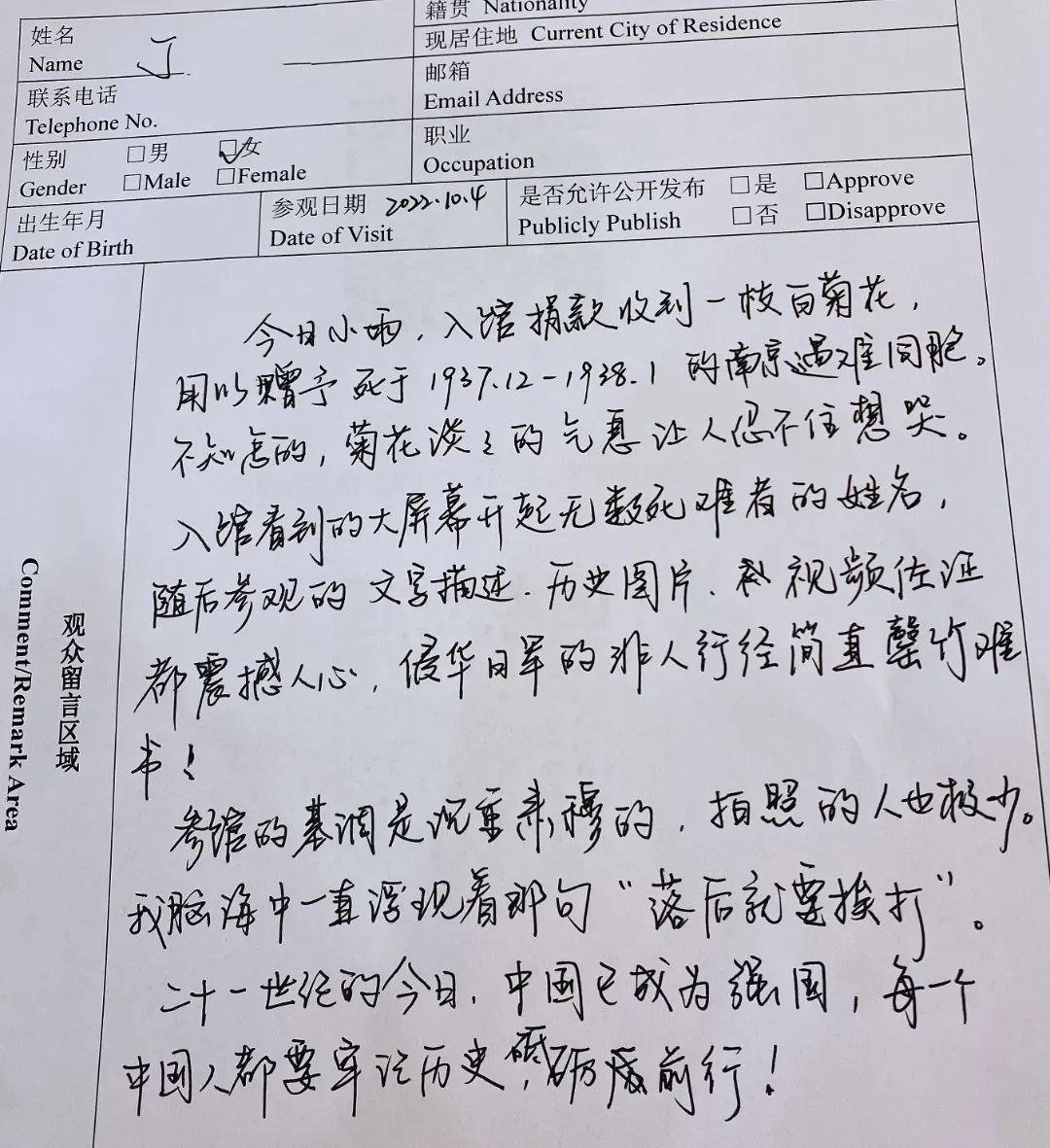 “令人震撼、痛心的参观之行,对于日军犯下的罪行感到十分气愤,作为中国人民不能忘记这段历史。铭记历史,珍爱和平,作为新一代中国青年应当承担起保护祖国、开创未来之责!”