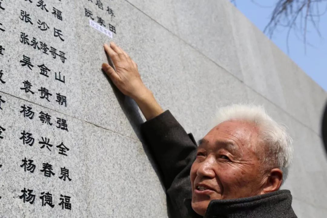 阮定东在纪念馆“哭墙”前手指爷爷阮家田的名字