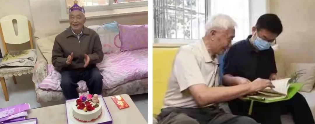 左图:纪念馆登门为阮定东庆生;右图:纪念馆副馆长时鹏程登门关心阮定东的生活