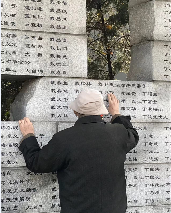 我曾经听小姑说,2017年11月27日,她陪我爷爷去侵华日军南京大屠杀遇难同胞纪念馆参加《每个人的12.13》微电影的拍摄,当时有一个镜头是爷爷用手抚摸“哭墙”上自己亲人的名字。当爷爷触摸到“哭墙”上太祖父的名字时,爷爷的右手竟微微颤抖了,手指下意识地向后缩了一下,但又迅速摸回到自己父亲的名字上。爷爷这细微的动作被我小姑看在眼里,难过在心里。这面“哭墙”就如同一座穿越时空的精神桥梁,成为了爷爷和已逝亲人话话家常的精神寄托。