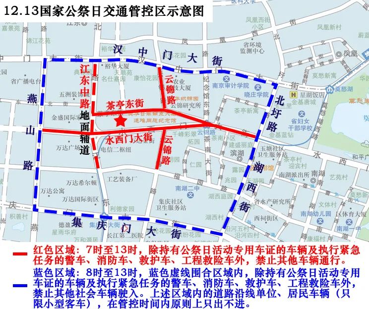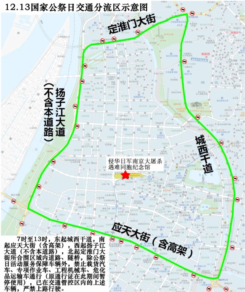 12月13日7时至13时,东起城西干道,南起应天大街(含高架),西起扬子江大道(不含本道路),北起定淮门大街所围合区域内道路、隧桥,除公祭仪式活动服务保障车辆外,禁止载货汽车、专项作业车、工程机械车、危化品运输车通行(原通行证在此期间暂停使用)。7时之前已在该区域内的上述车辆,管控期间严禁上路行驶。