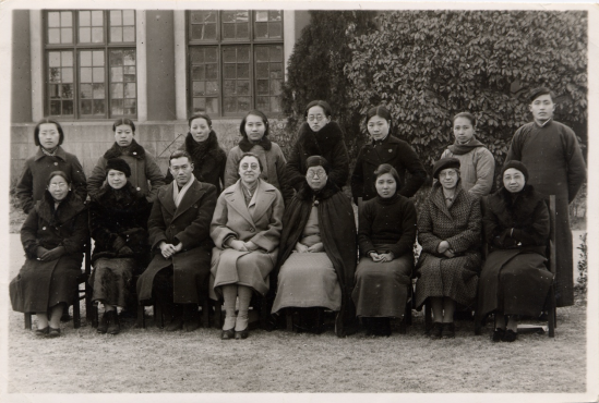 金陵女子文理学院难民营的职员与工作人员,前排左三为陈斐然、左四为魏特琳、左五为程瑞芳