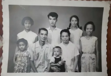 摄于1963年的全家福,陈斐然和妻子端坐中间,陈朝壮(后排左二)意气风发,陈朝一(前排左一)还是女童模样,乖巧地依偎着父亲
