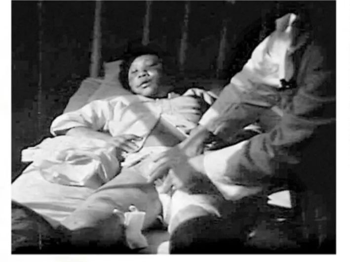 马吉拍摄的画面中,罗伯特·威尔逊医生正在为面部及身体肿胀、遍体鳞伤的李秀英检查伤口