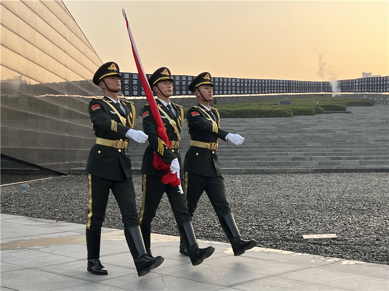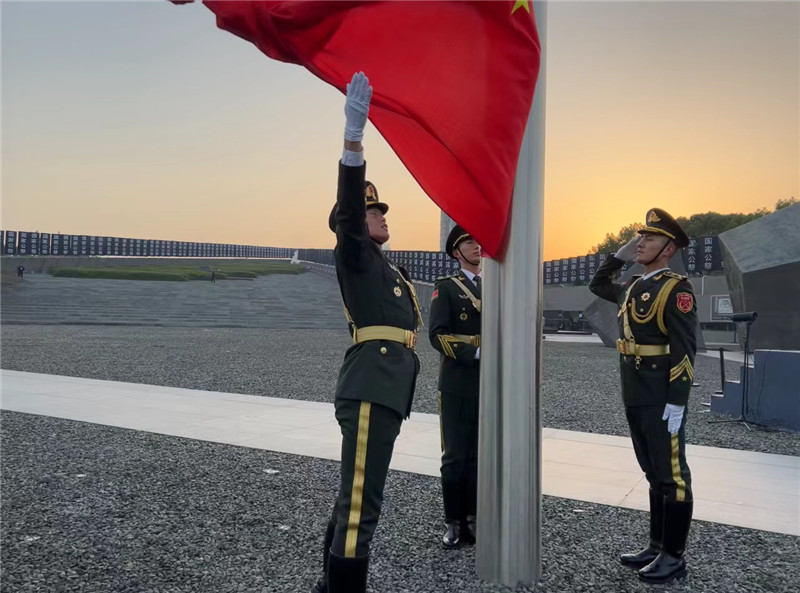 8时整,纪念馆在公祭广场举行升国旗、降半旗仪式。在嘹亮的国歌声中,中华人民共和国国旗徐徐升起,又缓缓降半。我们以国之名,悼念南京大屠杀死难者。
