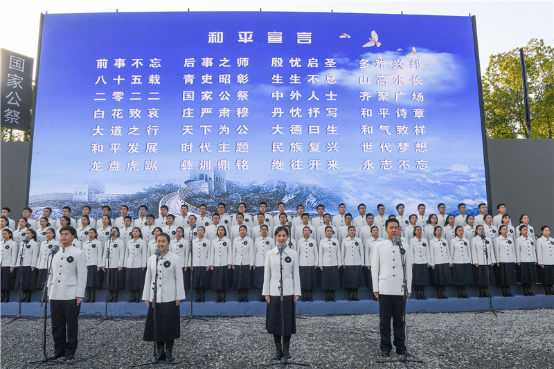 今天,我们在这里隆重举行南京大屠杀死难者国家公祭仪式,深切缅怀南京大屠杀的无辜死难者,缅怀惨遭日本侵略者杀戮的死难同胞,缅怀为中国人民抗日战争胜利献出生命的革命先烈和民族英雄,缅怀同中国人民携手抗击日本侵略者而献出生命的国际战士和国际友人,表达中国人民坚定不移走和平发展道路的崇高愿望,宣示中国人民牢记历史、不忘过去,珍爱和平、开创未来的坚定立场。