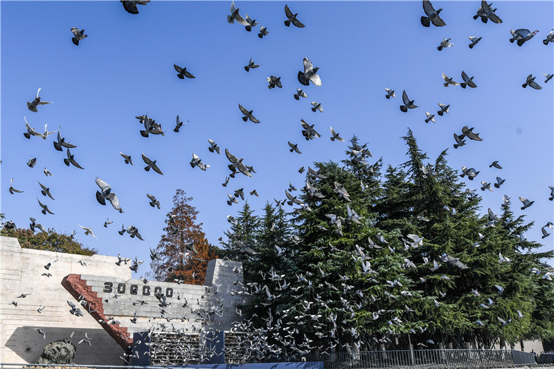 6名社会各界代表撞响“和平大钟”。伴随着3声深沉的钟声,3000只和平鸽展翅高飞,寄托着对死难者的无尽哀思和对世界和平的无限期许。