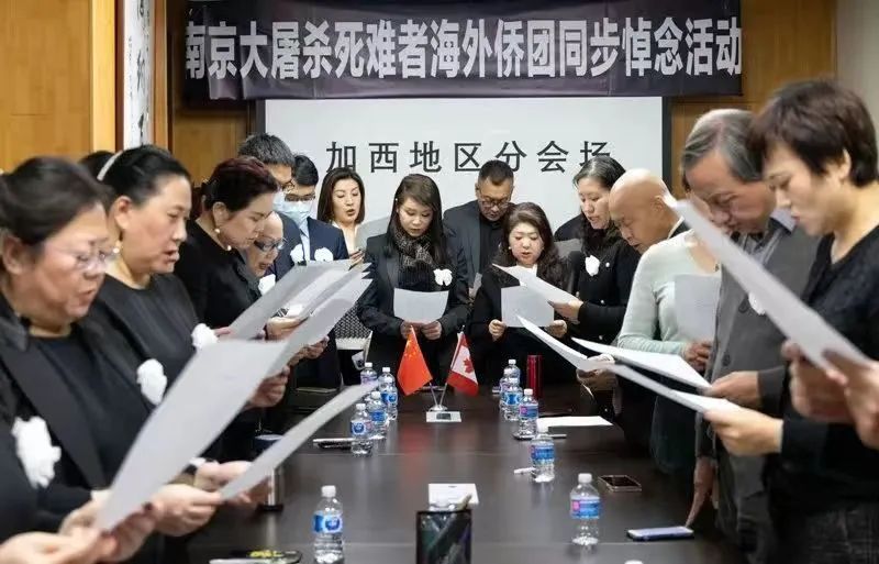 在南京大屠杀死难者海外侨团同步悼念加拿大西部地区分会场,当地时间12月12日下午6点,加拿大华人社团联席会、加拿大江苏华人联合总会和加拿大华人妇女联合会在温哥华联合举办了南京大屠杀死难者祭奠仪式以及《人类的浩劫——1937南京大屠杀》史实展。悼念活动中,温哥华华人代表肃立默哀。加拿大华人社团联席会执行主席薛晓梅致辞。她说:“我们身在海外的华人华侨应担起传播南京大屠杀历史真相的责任,历史不容篡改,同时教育华裔后代勿忘历史、让和平代代延续,永远传递。”加拿大江苏华人联合总会及加拿大华人妇女联合会会长徐凌是土生土长的南京人。她在活动中说:“南京大屠杀惨案铁证如山、不容篡改。我们不是要延续仇恨,而是要唤起每一个善良的人们对和平的向往和坚守。”中国驻温哥华侨务处主任陈青杰及侨务领事杨光参加了悼念活动。