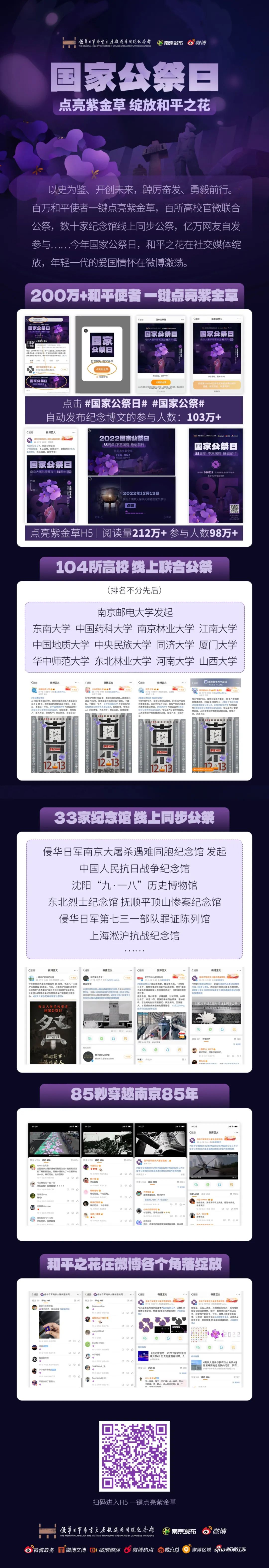 今年国家公祭日期间,纪念馆联合新浪江苏在微博上线点击#国家公祭#、#国家公祭日#话题页面,自动发布纪念博文功能。数百万网友自发参与,一键点亮紫金草。104所高校官微线上联合公祭,33家纪念馆线上同步公祭,和平之花在全网绽放,年轻一代的爱国热情在全网激荡。