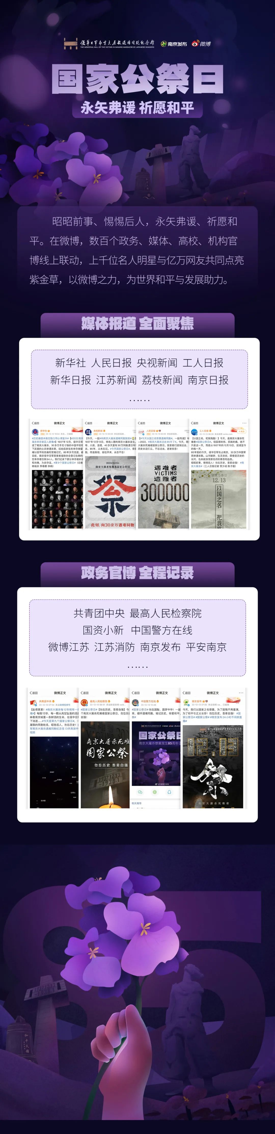 12月13日当天,数百个政务、媒体、高校、机构官博线上联动,全程记录,以微博之力为世界和平与发展助力。