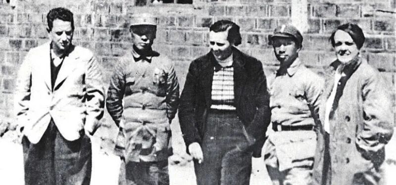 左起:汉斯·希伯、陈毅、加拿大护士尤恩、粟裕、美国记者史沫特莱