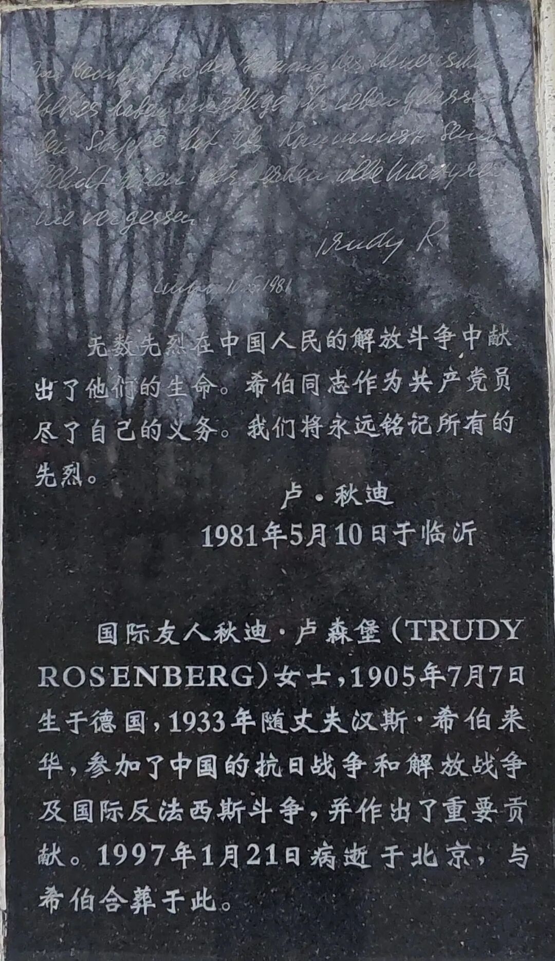在位于山东临沂的华东革命烈士陵园中,汉斯·希伯的墓碑上写着“为国际主义奔走欧亚,为抗击日寇血染沂蒙”。