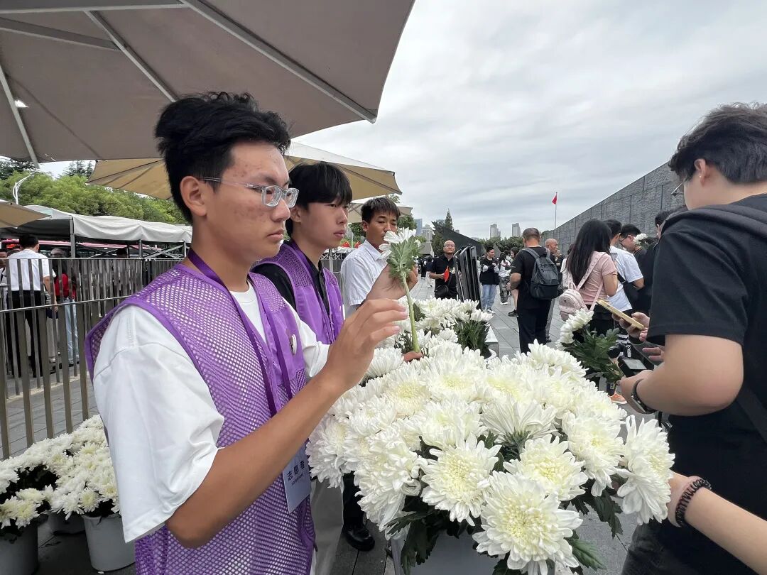 李雨宸是南京农业大学大一新生,也是纪念馆的新志愿者,与同伴一起在一号门捐款献花点向观众分发菊花。参加本次服务之前,他特意对自己的岗位内容和背后的含义做了了解。今天场馆开门后,观众们就在踊跃为大屠杀幸存者老人捐款。“作为在宁高校大学生,我觉得我们有责任来纪念馆为世界各地远道而来的观众服务。”李雨宸自豪地说。