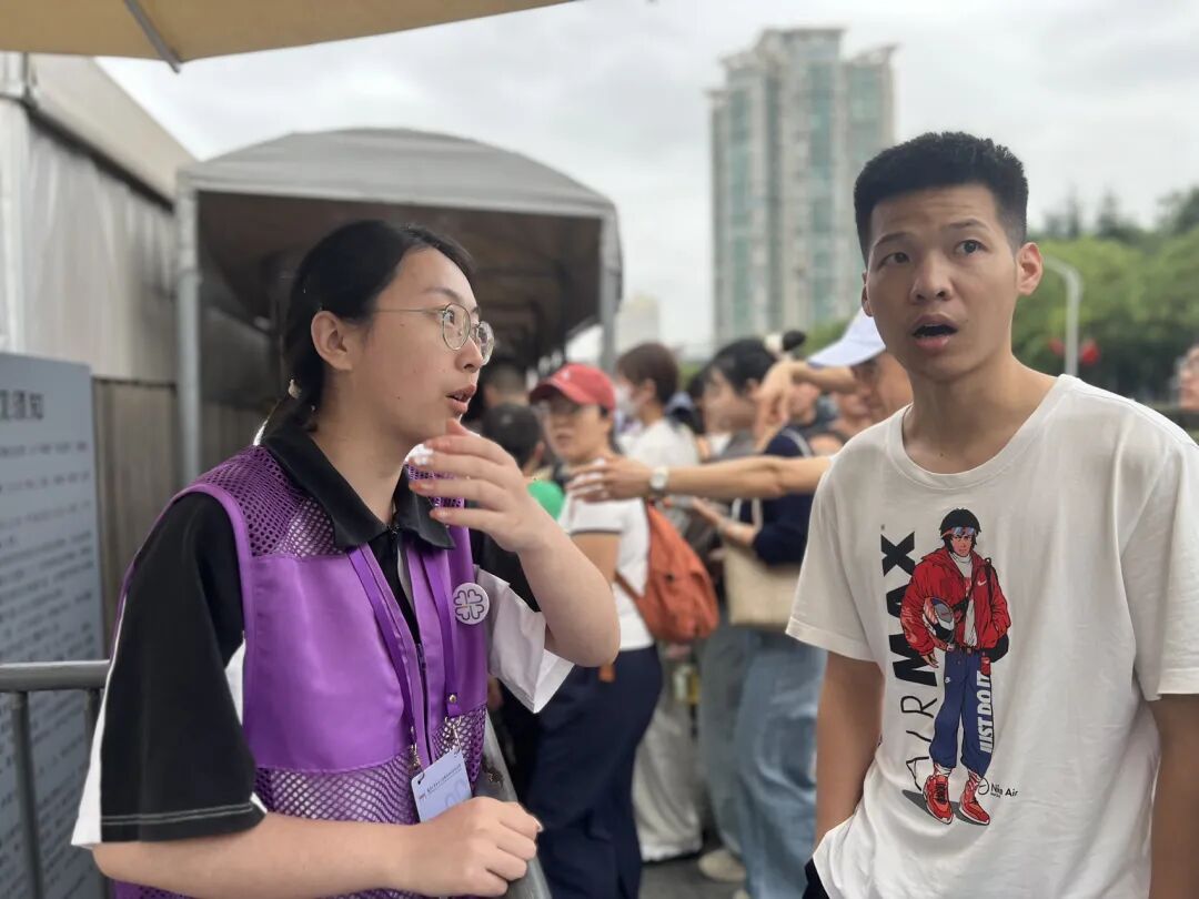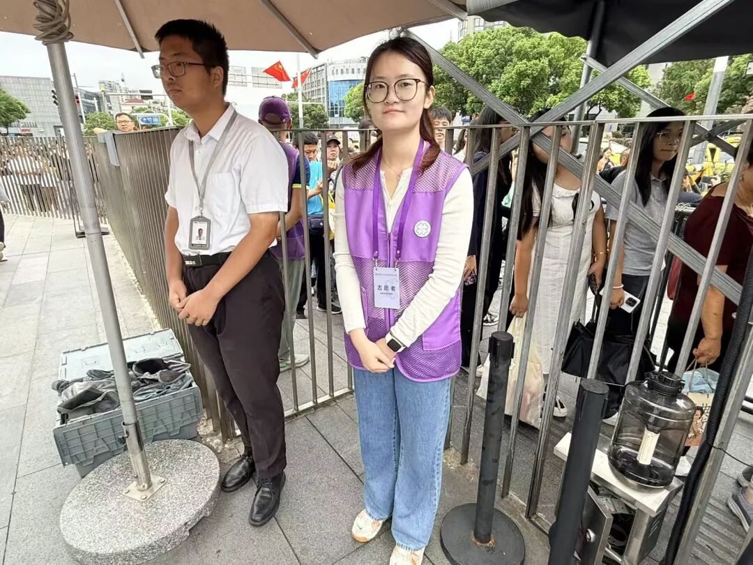 在南京师范大学读大四的陆美婷是一位经验颇丰的志愿者,在穿上纪念馆的紫马甲之前,曾在玄武湖做过志愿服务,因而在预检口面对观众各种问题时,回答、指引从容不迫、彬彬有礼。小陆说:“在这里志愿服务遇到的观众需求较为集中,虽然需要做许多重复性的回答,但我还是会更投入,因为国庆在这里我感受到了那种浓浓的民族氛围,也让这次志愿服务更有纪念意义。”