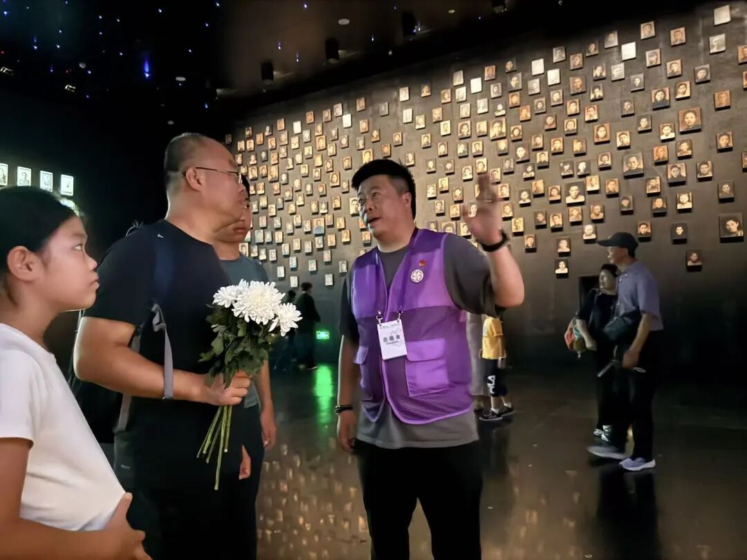 小米青年志愿服务队南京分队队长刘亚东加入纪念馆紫金草志愿服务队已经两年多了。他不仅是忙碌的高级产品运营经理,还是两个孩子的父亲。近两年来,他放弃休息时间,在馆累计服务时长超过200小时。在他的影响下,小米南京的小伙伴们也计划加入紫金草志愿服务队。今年国庆,他成为了序厅点位的讲解志愿者。刘亚东感慨道:“随着两年来的不断熟悉,各个点位的解说内容已逐渐内化于心,讲解也愈发自然流畅。在我看来,讲解工作不仅是为了帮助观众了解这段历史,更承载着一份沉甸甸的责任——提醒人们铭记历史、珍爱和平。”