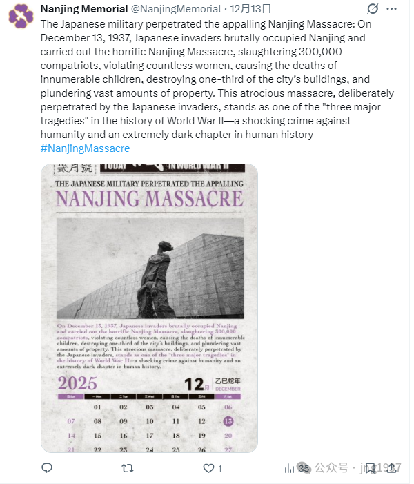 2025年12月13日,第十二个南京大屠杀死难者国家公祭日以国之名,悼我同胞,祭民族之殇。由我馆主持的#国家公祭#话题阅读数达62亿,#国家公祭日#阅读量达266亿,这背后有你对历史的铭记对和平的助力。