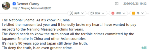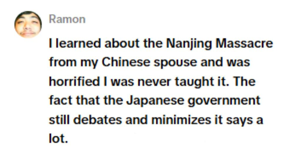 国外网友留言:“我从中国配偶那里了解到南京大屠杀,我感到极度震惊,我从来没有被教过这段历史。日本政府至今仍在争论、淡化这段历史,这本身就很能说明问题。”